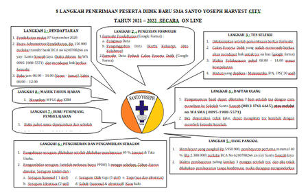 1. Melakukan pembayaran pendaftaran sebesar Rp. 150.000,00 melalui transfer ke rekening BCA dengan nomor rekening 6240788266 a.n. Yay. Santo Yoseph Jaya.2. Mengirimkan bukti pembayaran ke WhatsApp SMA 0895-1988-5571 (sertakan nama orang tua dan nama calon peserta didik)3. Mengisi formulir pendaftaran melalui tautan yang dikirimkan melalui via WhatsApp SMA.4. Setelah berkas dilengkapi, akan mendapatkan tautan untuk tes penerimaan calon peserta didik baru.5. Waktu pelaksanan tes masuk SMA sesuai kesepakatanInformasi lebih lanjut, hubungi Nomor Telepon : 081317616645 atau WA SMA 0895-1988-5571